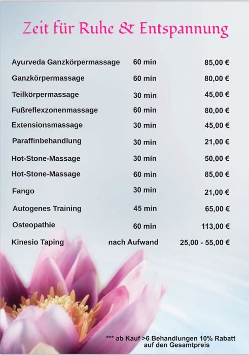Nutzen Sie eine Vielzahl unserer Therapieangebote auch vorbeugend für Ihre Gesundheit und Ihr persönliches Wohlbefinden.
